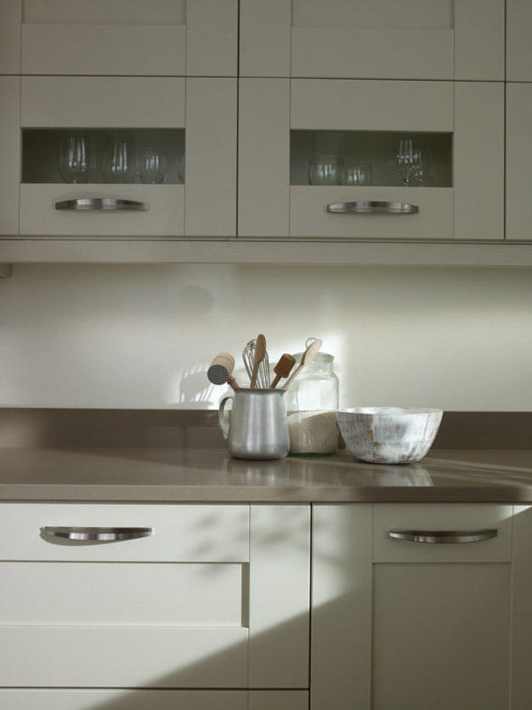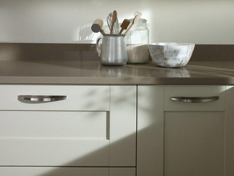 Another popular choice for kitchens in Ayrshire, Milbourne is a classic shaker door with a chunky frame and a subtle textured finish. The Almond finish is an easy going neutral and this kitchen really is the all in one cooking, working and relaxing space.